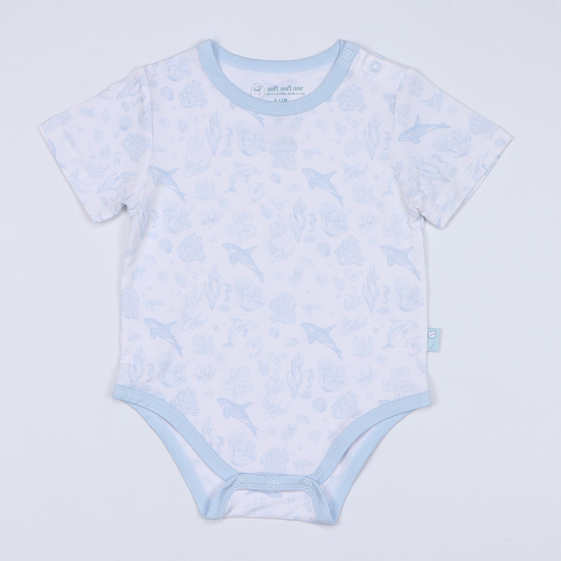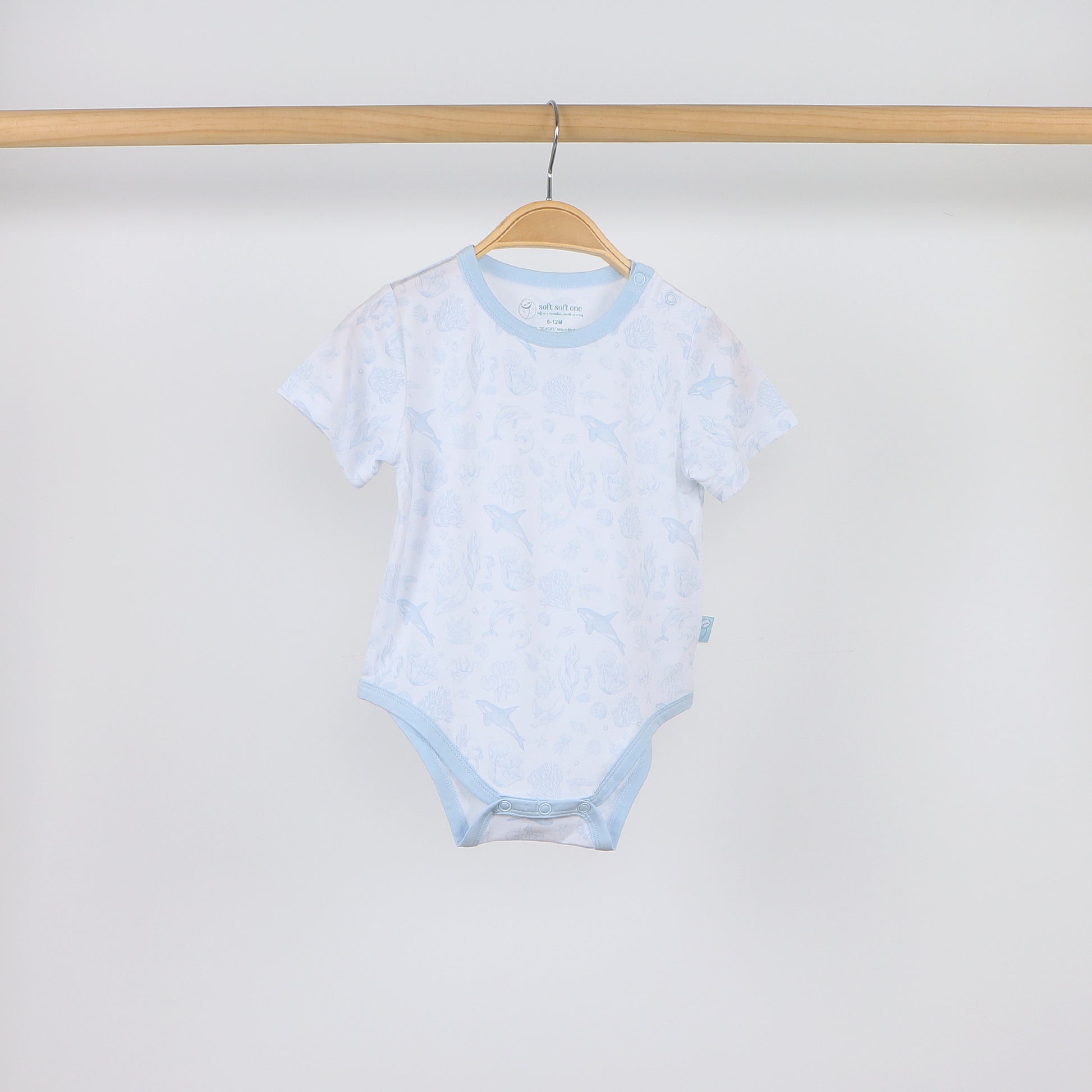 A calm ocean scene, drawn softly in pale blue linework. This baby bodysuit is made with our signature modal blend, giving it a silky, breathable touch that stays comfortable all day.